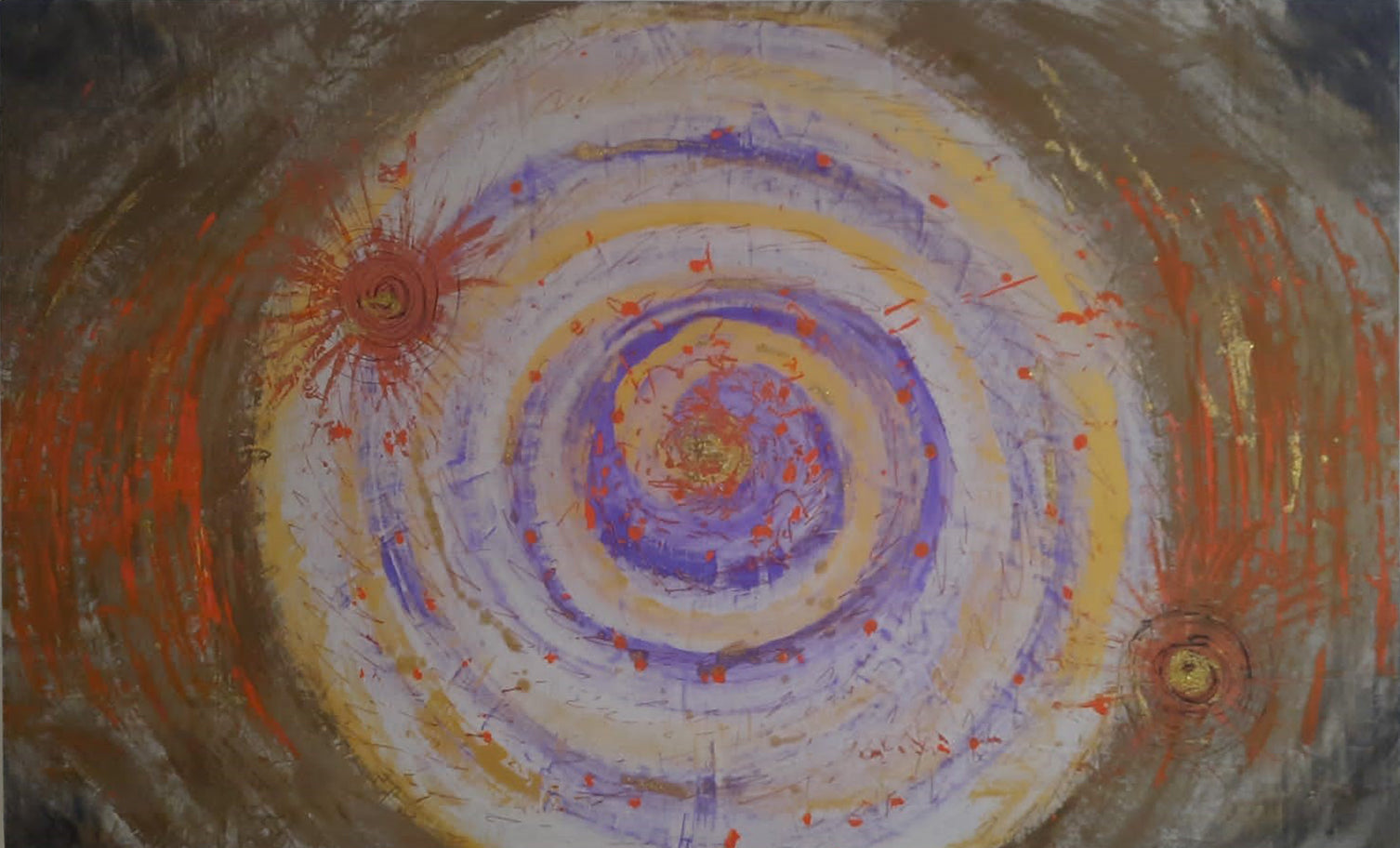 Il dipinto "Micro e Macro" rappresenta una spirale che nasce dal centro, con i colori viola, giallo e bianco, accompagnati da un tocco di rosso. Man mano che la spirale si espande, i toni si scuriscono, creando un contrasto che suggerisce il passaggio dal micro al macro, tra il particolare e l'universale. Le pennellate seguono con fluidità il movimento della spirale, creando una composizione che appare coerente e circolare. Il graduale passaggio dai toni chiari a quelli scuri intensifica la sensazione di profondità, conferendo all'opera una qualità dinamica e continua. Raffaella Corcione Sandoval è un'artista che ha vissuto tra il Venezuela e l'Italia, influenzando profondamente il suo percorso creativo. Dopo gli studi d'arte, ha esordito con mostre personali a Napoli e Roma, partecipando a importanti concorsi. La sua arte, inizialmente figurativa, ha preso una direzione più concettuale, arricchita dalla sua ricerca spirituale e filosofica. Ha sviluppato tecniche innovative, come la scultura in tessuto cristallizzato, e ha esposto in prestigiosi musei e biennali, esplorando temi di dualismo e armonia.