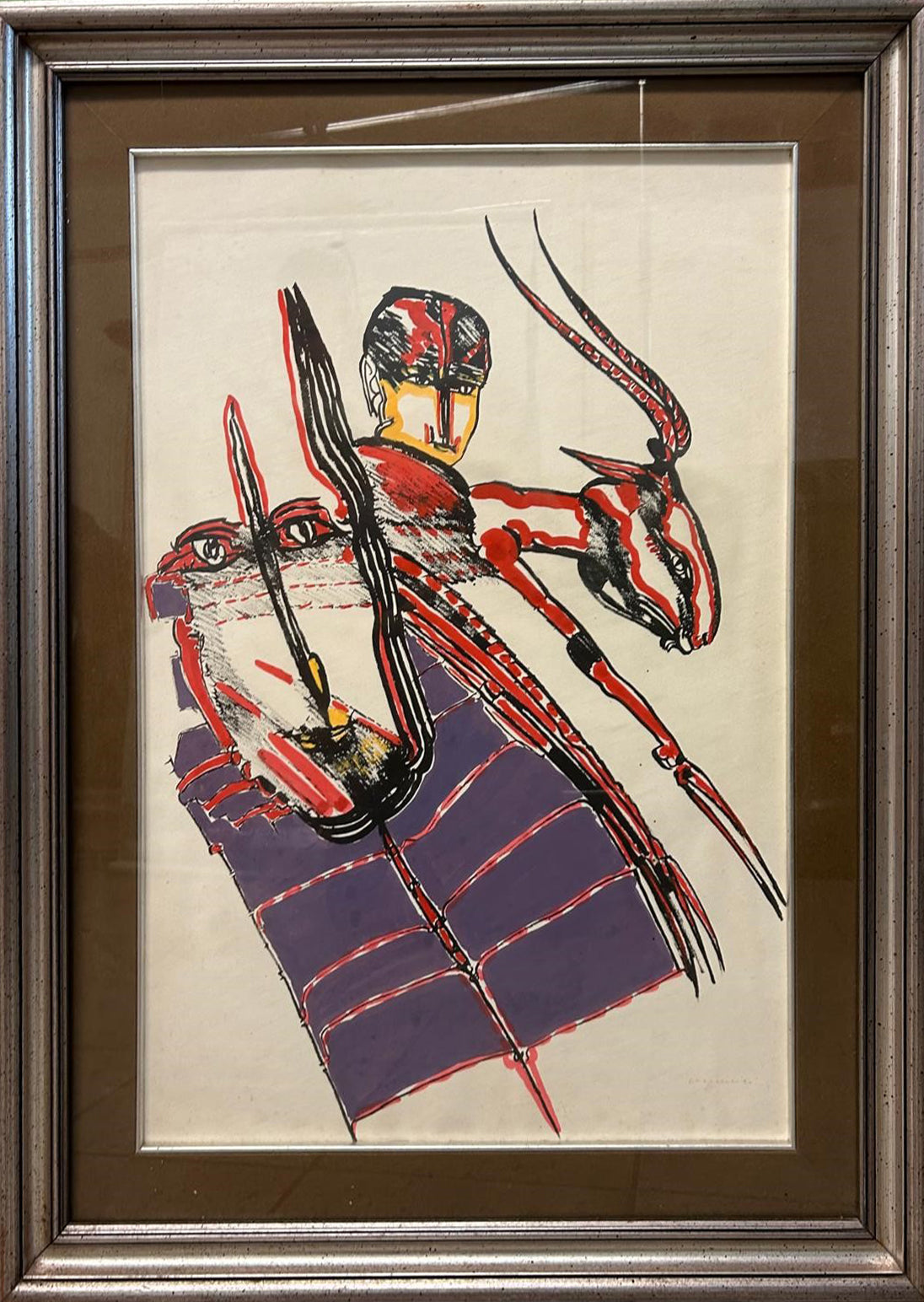 Remo Brindisi è stato artista italiano prolifico, non solo a livello europeo ma anche internazionale. L’incontro con artisti come Felice Carena, Ardengo Soffici, Ottone Rosai a Firenze gli daranno i giusti strumenti per arricchire la sua ricerca pittorica. La sua pittura si rivela fortemente espressionista, con tendenze informali, senza rinunciare a forme e colori vivaci. In questa composizione l’autore esprime con estrema audacia l’aspetto pastorale ed animale con combinazioni inusuali. L’enfasi del disegno avviene anche grazie alla tecnica retouché ovvero in campo artistico si riferisce al processo del ritocco di un’opera che nel campo dell'incisione e della stampa può riferirsi all'atto di modificare una lastra incisa per migliorare la stampa finale. Ciò può includere la pulizia delle linee, l'aggiunta di dettagli o il rafforzamento dei contrasti.