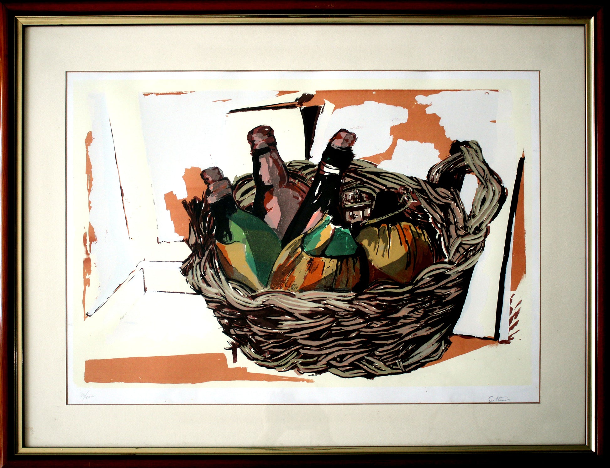 Il genere della “Natura Morta” vede la luce agli inizi del XVII secolo. Consiste nella rappresentazione di composizioni di soggetti inanimati, nella maggior parte dei casi fiori o frutta. Se all’inizio della sua storia era un’occasione per i pittori per cimentarsi in una riproduzione fotografica della realtà, con l’arte contemporanea la “Natura Morta” diventa anche un modo di interpretare la realtà, come per i cubisti o Giorgio Morandi. La serigrafia mostra come lo stile di Guttuso sia sempre in una via di mezzo tra realtà fenomenica e realtà noumenica dell'oggetto. Infatti la sua struttura disegnativa è solidissima, ancorata al mondo sensibile che ha davanti agli occhi. Tuttavia il modo di interpretare questo cesto con bottiglie dimostra che la sua percezione dell'oggetto e soprattutto dell'oggetto nello spazio, va oltre il fenomeno. Guttuso, tramite le zone di colore, indaga l'intero oggetto, tutto il suo volume e tutte le sue possibilità di interazione con lo spazio circostante. Renato Guttuso, nato a Bagheria nel 1911 e morto a Roma nel 1987, è stato un pittore molto impegnato nella politica e nel sociale. Il suo impegno artistico nasce dai suoi ideali socialisti, il disprezzo per l'ingiustizia sociale e gli abusi di potere. Partecipò al gruppo Fronte Nuovo delle Arti elaborando una pittura Realista - Espressionista maturando la sua "arte sociale".