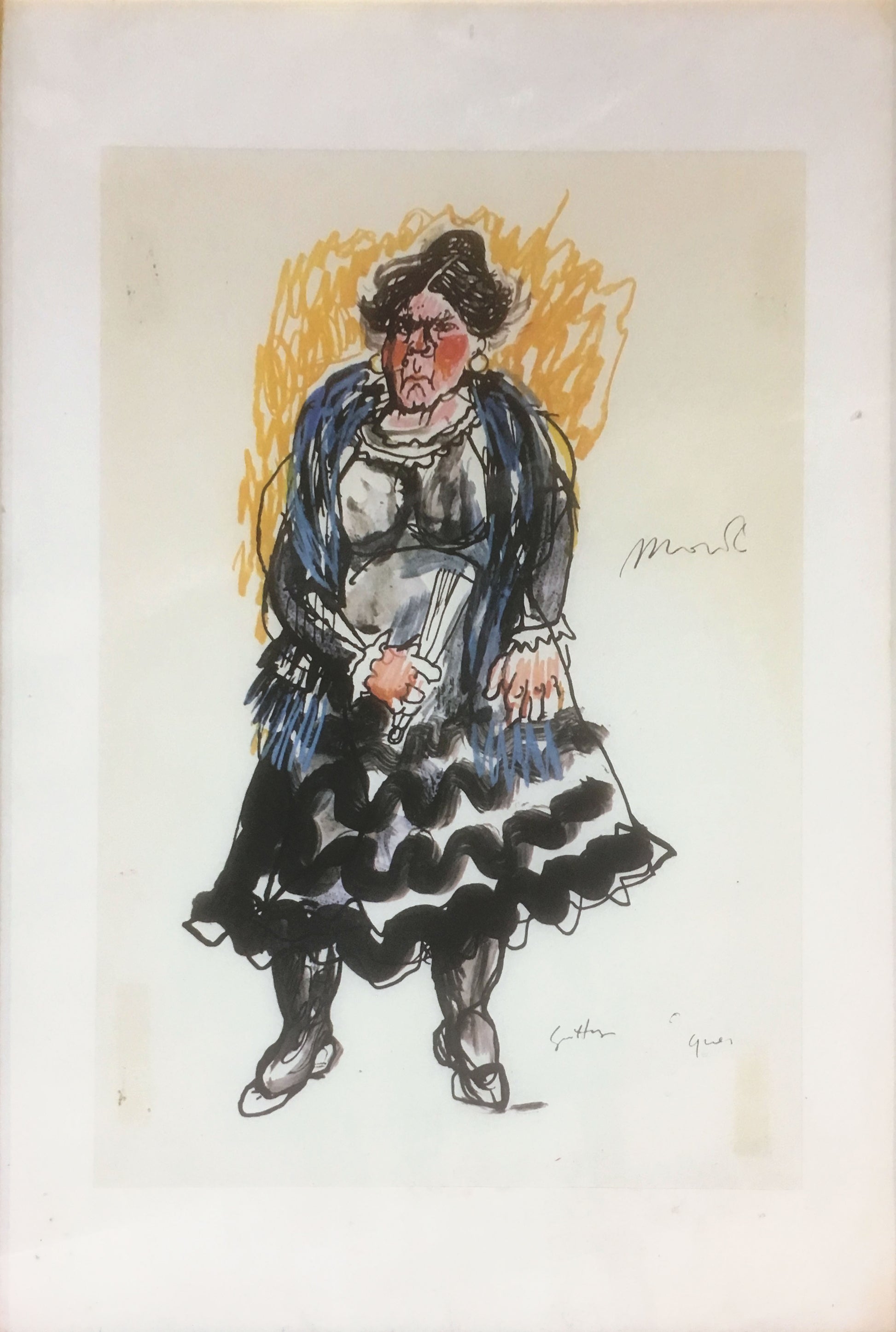 In questa stampa Renato Guttuso, che è un artista sempre propenso all'esaltazione, anche geometrica, dei volumi e del plasticismo, possiamo apprezzare, invece, un'esecuzione più sintetica, carica di freschezza. Sicuramente stimolato dal soggetto, un personaggio popolare, quasi folkloristico, l'artista ci dà una rappresentazione carica di immediatezza in cui il tratto nero e veloce sintetizza rapidamente il personaggio. Rilevante è poi l'elemento realista, tipico dell'arte di Guttuso che, anche in questa opera, viene fuori proponendo la caratterizzazione della fisionomia con verve espressionistica.