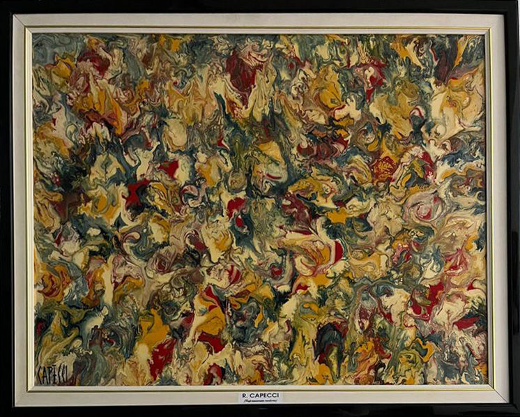 L’informale dell’artista Renzo Capecci si sviluppa su un esercizio percettivo. L’artista infatti parte dall’acquisizione dei dati sensibili e li rielabora nel suo personalissimo sentire. E così anche una composizione floreale perde in maniera quasi definitiva ogni contatto con la realtà fenomenica per tradursi in una pura trasposizione di materia e gesto. In effetti Renzo Capecci vuole cogliere l’impressione dell’oggetto, ma ciò lo porta a disgregare completamente la forma e a tradurre la sua percezione direttamente nella gestualità pittorica. In questa serie di dipinti l’artista è capace di dare vita ad una materia cromatica che sembra viva, dinamica e in continua evoluzione. Nell’intensità dei colori che si fondono in un organismo vitale, l’esistenza pulsa in bagliori lucenti e repentini.