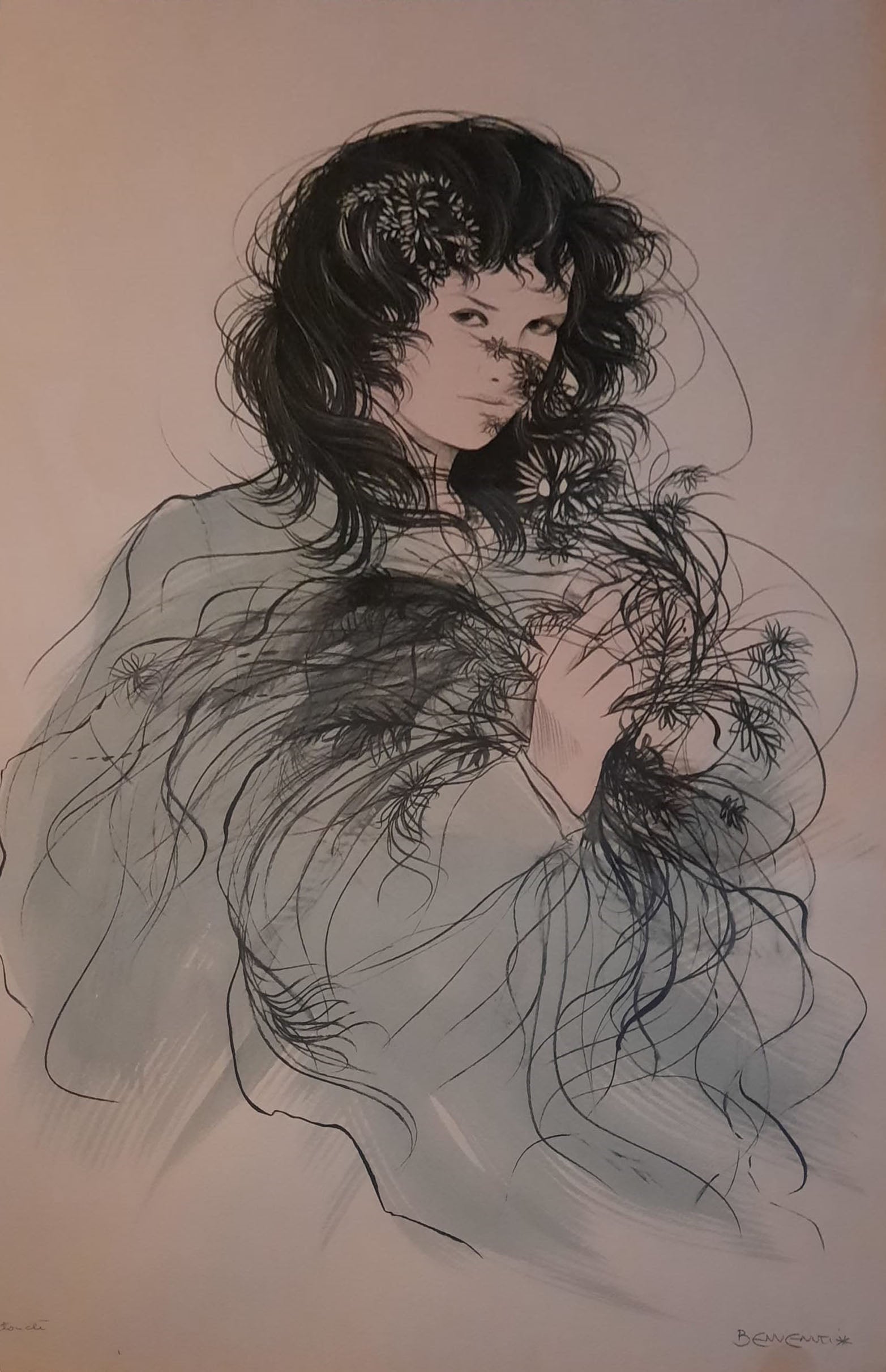 La figura femminile è al centro della produzione artistica di Riccardo Benvenuti che ha saputo rappresentare la donna nel suo stile originale e ricercato. L’estetica di questo pittore si basa su uno stretto connubio tra resa naturalistica ed eleganza grafica. Infatti il soggetto viene rappresentato in modo impeccabile, grazie anche alla notevole abilità tecnica di Benvenuti. Alla figura, delineata fisionomicamente e plasticamente, si aggiunge il corredo espressivo di sottili e raffinate linee grafiche, che con il loro andamento impostano un ritmo dinamico nell’opera. La caratteristica peculiare delle figure femminili di Riccardo Benvenuti è la perfezione del viso, che appare in una forma levigata, quasi fosse di porcellana. I capelli, invece, sono sempre mossi da una resa estremamente dinamica ed espressiva di tratti sottili. Il resto della figura viene strutturato, ancora, con dei sintetici segni grafici. Tutto ciò connota il soggetto come una presenza eterea e diafana.