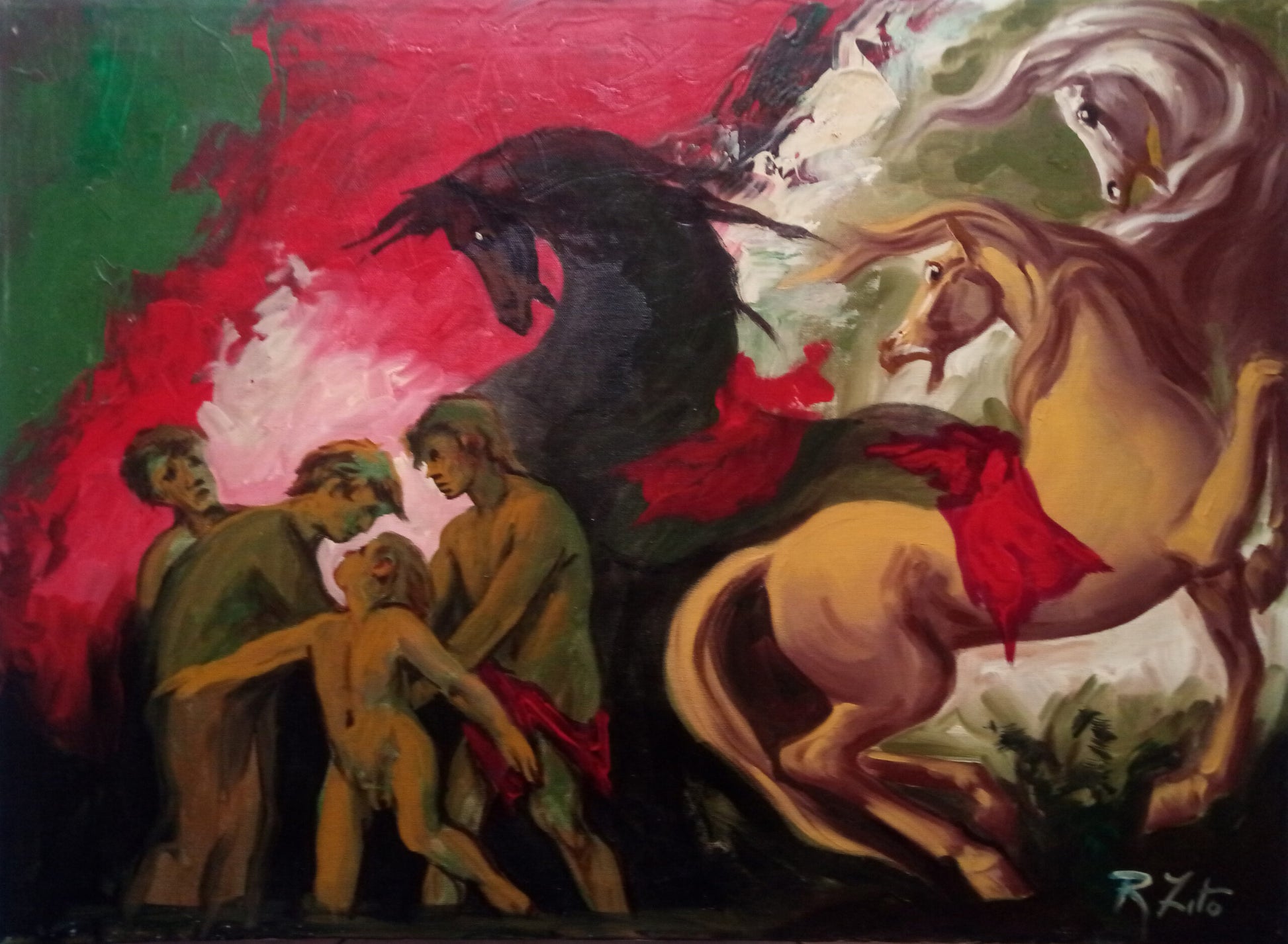 Nell'opera che fa parte di una serie che si distingue per le complesse iconografie in cui compaiono citazioni classiciste, Rodolfo Zito dà sfoggio del proprio stile ancora, in qualche modo, legato al figurativo, ma elegantemente espressionistico. È sempre un linearismo mosso a forgiare le figure ed esaltarne il contorno, per dare vita ad una composizione piena di movimento. Il colore, dalle tonalità accese, esalta ulteriormente la verve espressionistica dell’opera. Ma un’ulteriore e fondamentale componente dinamica e teatrale viene aggiunta dalla composizione, la quale scardina completamente le tradizionali regole spaziali e prospettiche. I soggetti, così, vanno a disporsi su molteplici direttive in uno spazio non lineare e complesso. Emblematica è poi la figura del cavallo, molto ricorrente nelle opere di Rodolfo Zito e sempre strutturato su una linea nervosa e movimentata simbolo della sua energia e della sua velocità.