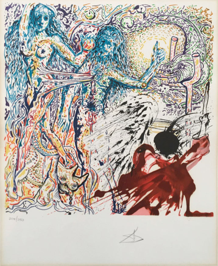Rispetto alla produzione su tela di Dalì l'opera si differenzia soprattutto per il disegno che la contraddistingue. Infatti, al posto dell'esaperato plasticismo iperrealistico, qui abbiamo una composizione risolta con l'eleganza disegnativa in una composizione piena e affollata. Notiamo comunque che permane la volontà dell'artista di indagare i volumi delle figure ed esaltarne i valori plastici. Tutta la composizione è vivacizzata da tocchi di colore frenetici ed un linearismo frenetico che aggiungono una forte componente dinamica alla composizione.