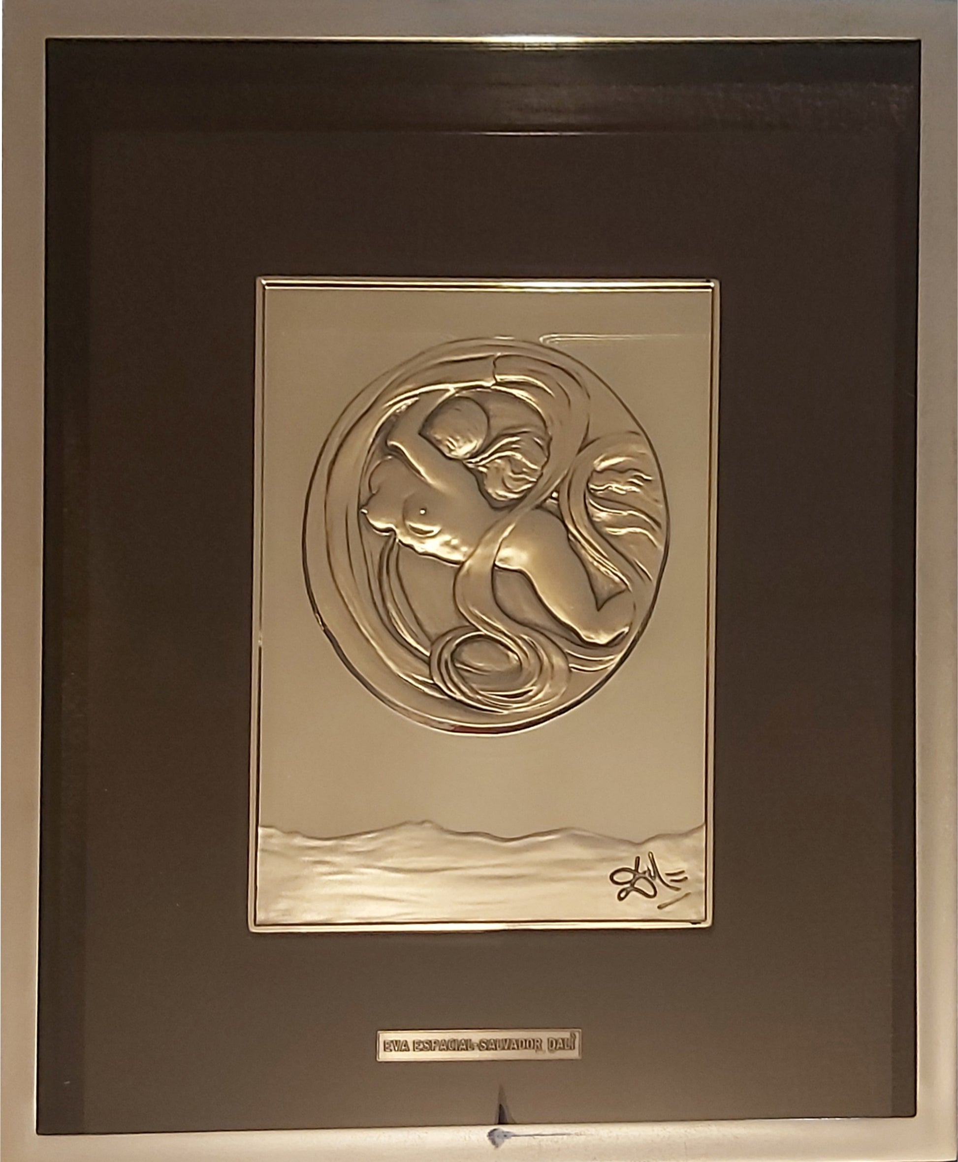 In questa opera il maestro del Surrealismo Salvador Dalì mette da parte le sue usali complesse iconografie di ispirazione onirica per concentrare tutta la composizione sul nudo femminile, vero protagonista della scultura. Tuttavia la maniera in cui viene trattato il soggetto ha numerose implicazioni con l’estetica surrealista. In primo luogo è chiaro il riferimento citazionista, sempre presente in Dalì, nei confronti dell’arte del passato, classica in particolare. Così la figura di Eva si esalta in un plasticismo esasperato (vero marchio di fabbrica dell’artista catalano) che ne gonfia i volumi quasi portandoli alla deformazione. Inoltre possiamo constatare come anche in questa composizione, con pochi elementi, Dalì riesca comunque a creare un'aura di mistero e di enigma irrisolvibile. La testa della donna è coperta da una velo che si dispiega, lunghissimo, in contorte volute. Il tutto nello spazio assai complesso che l’artista ha creato all’interno del tondo, dove velo e corpo della donna instaurano un bellissimo dialogo di linee e di curve. Tutto ciò è possibile tramite la tecnica e la genialità di un grande artista, il quale anche in uno spazio ridotto e in una composizione apparentemente semplice è capace di concentrare una grande complessità di forme e di concetti.