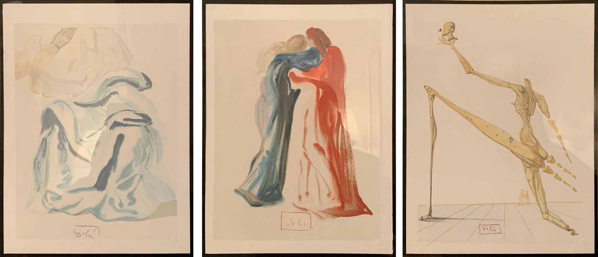 Una delle stampe è estremamente esemplare del linguaggio artistico di Salvador Dalì. Già a partire dallo spazio creato dall'artista, costruito sulla prospettiva ostentata e illusoria di quella che potrebbe essere una landa desolata o un palcoscenico. In primo piano campeggia una figura emblematica col suo plasticismo esasperato, la consistenza molle del suo organismo e le deformazioni eccessive e impossibili. Le altre due stampe sono estremamente interessanti perchè ci fanno apprezzare un lato insolito di Dalì. Un Dalì che punta tutto il potenziale espressivo sul colore e sintetizza le forme velocemente con pochi rapidi tratti. Tuttavia anche in questo contesto differente possiamo notare tematiche care al pittore catalano. In particolare le figure, dagli ampi panneggi, rimandano ad un citazionismo dall'arte antica che è tipico del grande surrealista.