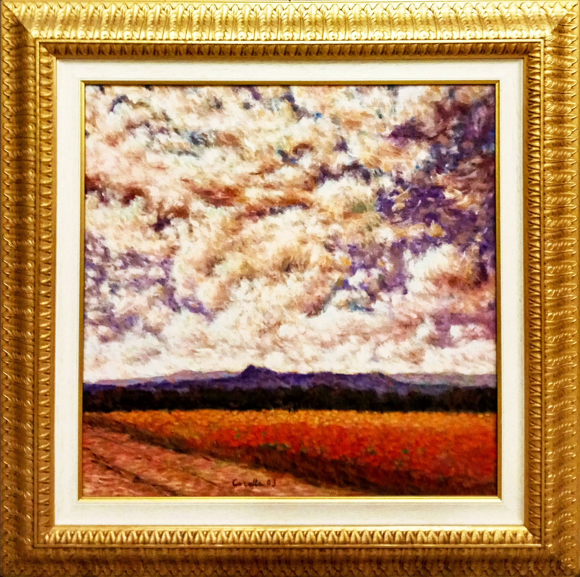 Il fare artistico del pittore Salvatore Carella fa affidamento soprattutto sul colore. E' la stesura pittorica, infatti, a costruire e dare struttura a questo suo paesaggio. L'opera può essere divisa in due parti. Quella inferiore dei campi è costruita su una suggestiva fuga in diagonale che dà profondità. A livello formale qui il pittore effettua una stesura divisionista, con i piccoli tocchi di colore che vanno a ricostruire i campi dai colori brillanti. Nella metà superiore del dipinto, invece, campeggia il cielo, in cui la stesura pittorica si fa più densa di colore.