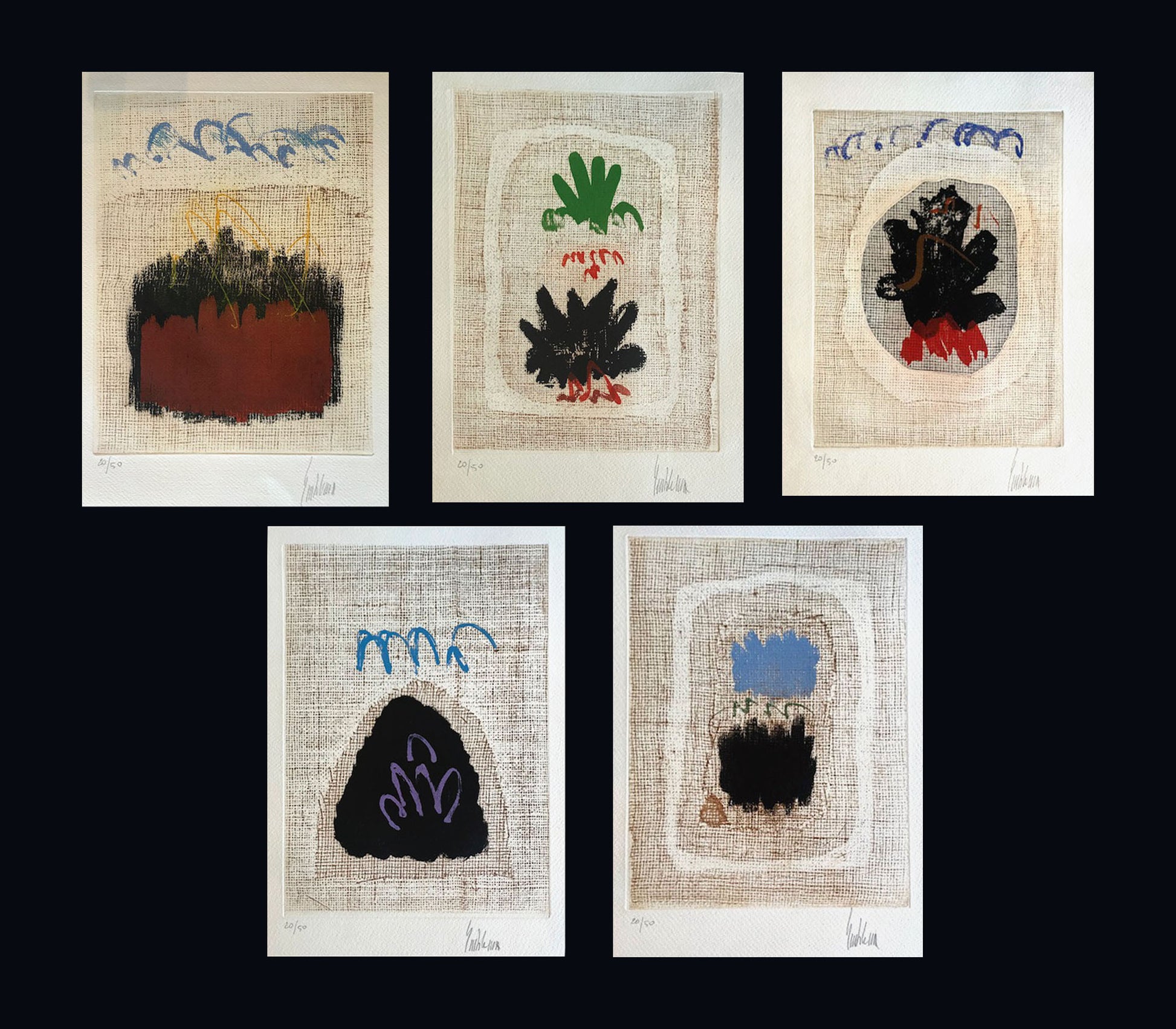 Questa serie di opere mostrano chiaramente le diverse componenti del linguaggio artistico elaborato da Salvatore Emblema. Per questo artista è fondamentale il ricorrere ad un supporto come la tela grezza, un elemento significativo della produzione meccanica, che determina il rifiuto del supporto tradizionale a favore di un oggetto evocativo della società contemporanea. Nel caso di queste acqueforti, stampate su carta, la tela grezza viene citata, riproponendone la trama irregolare e grossolana anche nella stampa, in quanto elemento imprescindibile del fare artistico di Salvatore Emblema. Si sovrappone, a questa tramatura, una gestualità pittorica che può essere ricondotta all'estetica dell'informale.