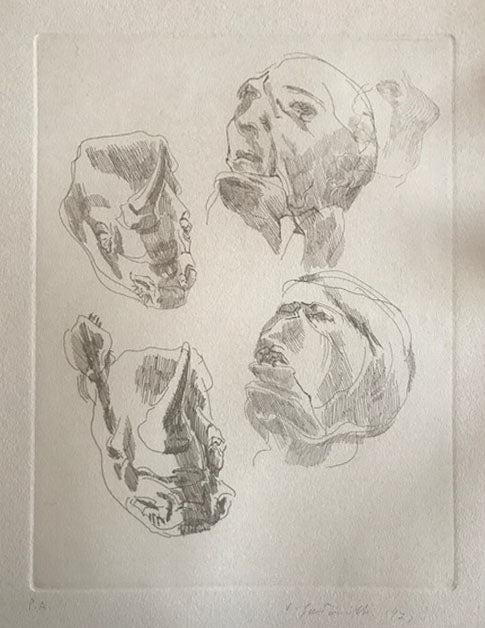 La serigrafia è una prova d'autore in cui l'artista fa uno studio su due volti umani e due figure di rinoceronte. A livello concettuale ed estetico possiamo notare come l'autore tenda a sintetizzare le forme in ideali solidi geometrici. Le fisionomie vengono generalizzate a favore dei volumi. Sul piano formale l'artista realizza i soggetti con una linea molto movimentata e sinuosa e dà rilievo ai volumi mediante un fine tratteggio.