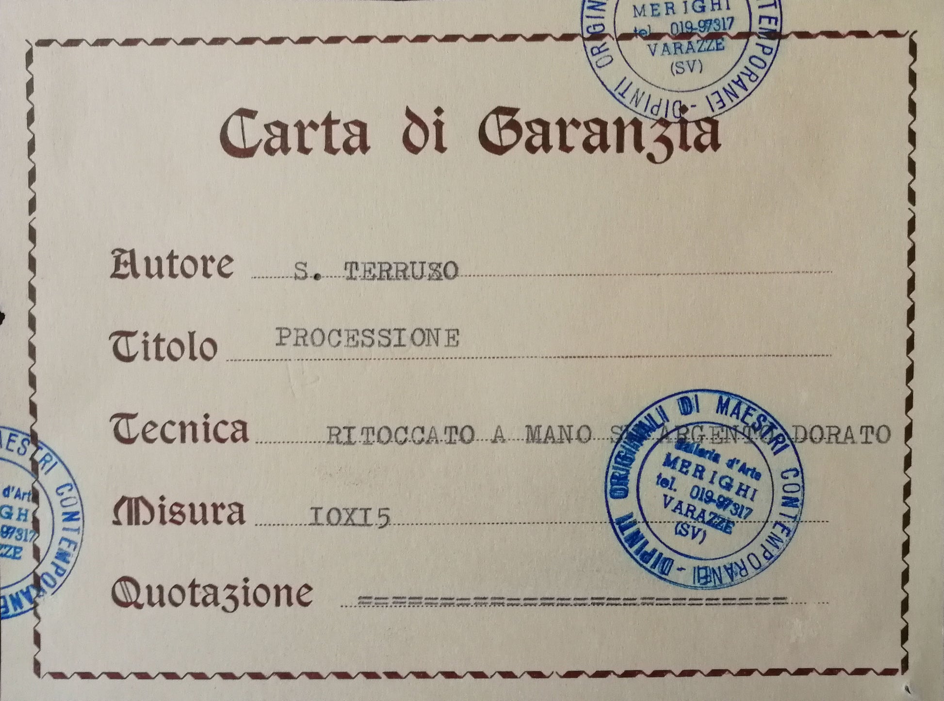 La transazione avviene nella massima sicurezza del venditore e dell'acquirente, siamo noi a farci carico della conformità (provenienza, autenticità, stato di conservazione) dell'opera e ad occuparci della spedizione.