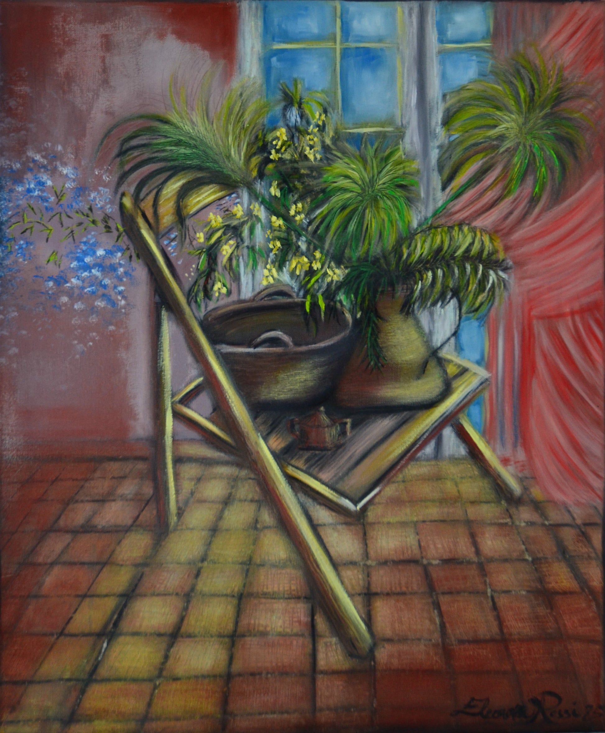 L'opera nasce da una composizione realizzata dall'artista posizionando una sedia con degli oggetti antichi posti al di sopra della sedia con aggiunta del verde dato da foglie di papiri e dal gelsomino di San Giuseppe. Il tutto posizionato all'interno del suo laboratorio posto davanti alla finestra. Il quadro nasce da uno studio della prospettiva, delle distanze, della luce e dal desiderio di riportare su tela la nostalgia del passato rappresentata dalla presenza degli oggetti antichi in rame.