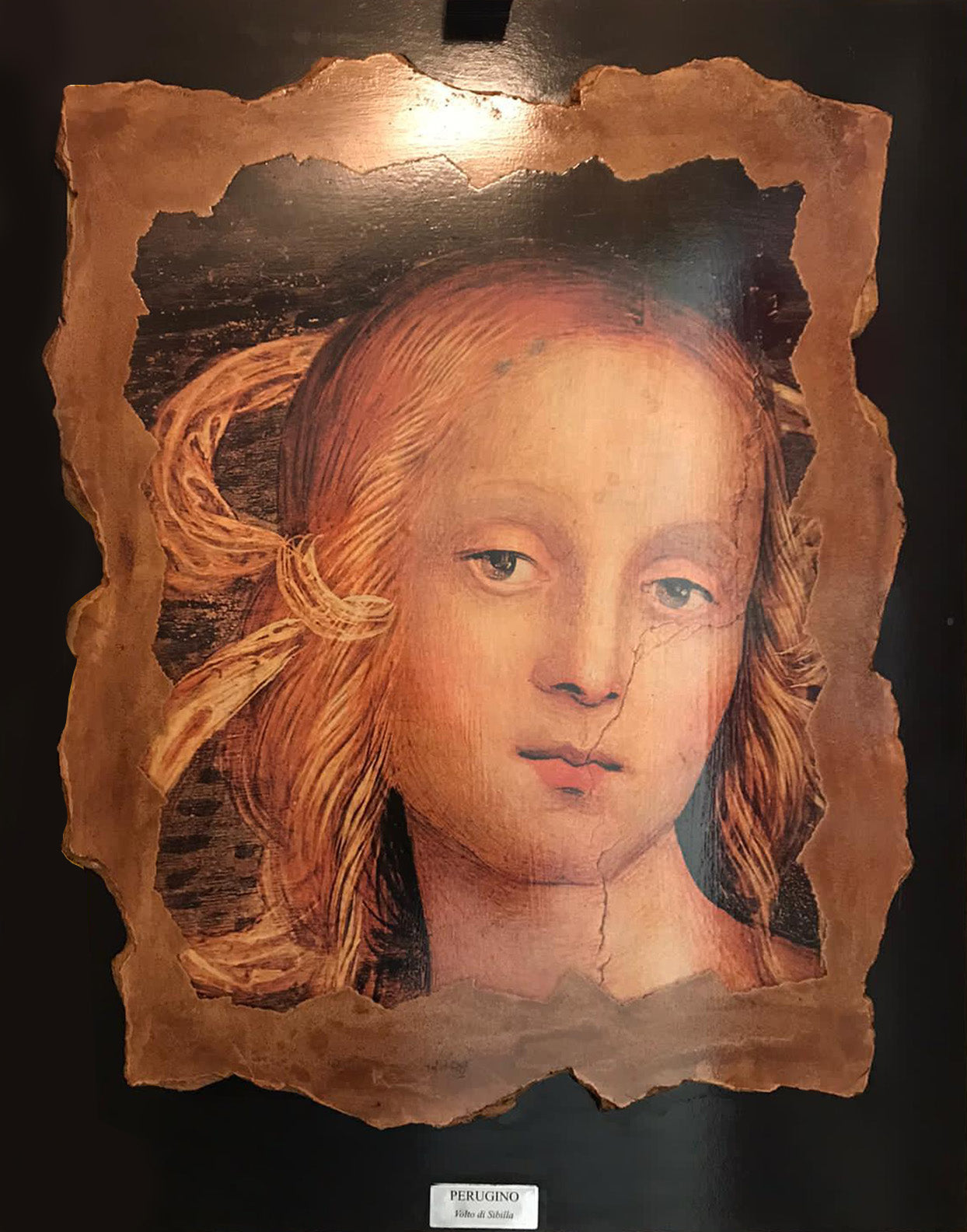 Il soggetto è stato ripreso da una delle opere più importanti di Pietro Vannucci, detto il Perugino, ovvero gli affreschi della Sala delle Udienza del Collegio del Cambio, che l'artista realizzò a Perugia tra il 1498 e il 1500. Il frammento riportato in questa copia d'autore è stato ripreso da un volto di una sibilla presente nelle lunetta che riporta “L'Eterno tra gli angeli sopra un gruppo di profeti e sibille”.