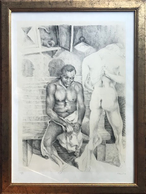 Questa litografia è molto esplicativa di uno degli aspetti dello stile del pittore Ugo Attardi. Accanto al caldo espressionimo fondato sul colore l'artista unisce anche una tipologia di opere in cui pone in primo piano l'esaltazione dei valori plastici, come in questo caso. Si può notare come al centro della composizione ci sia proprio il soggetto principale pieno nella sua volumetria pesante e tornita. Tale figura diventa quasi un centro gravitazionale intorno al quale sembra interagire l'ambiente. Lo spazio intorno, infatti, va articolandosi secondo molteplici direttive e diverse linee prospettiche, con un'operazione memore dell'arte cubista.
