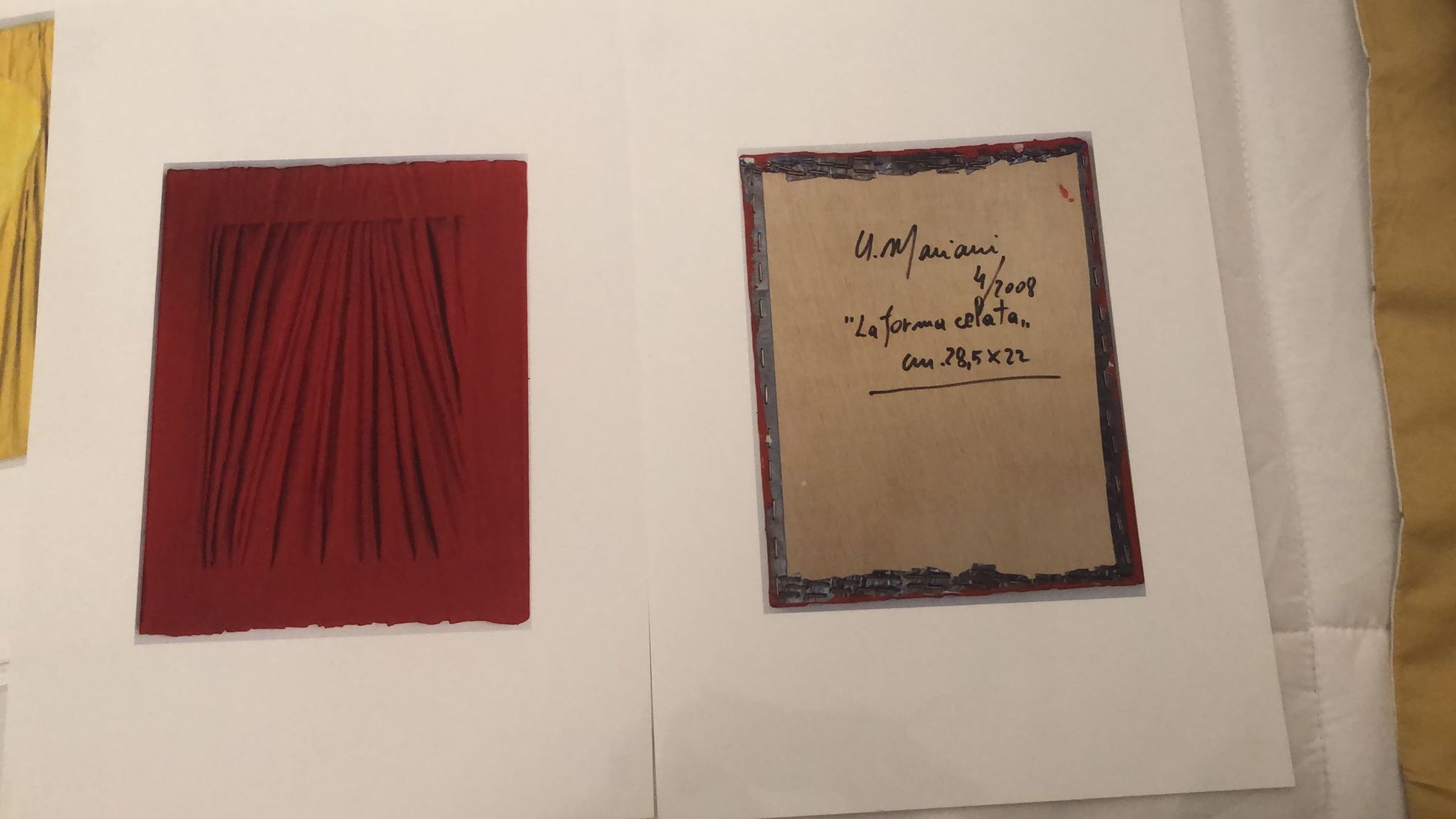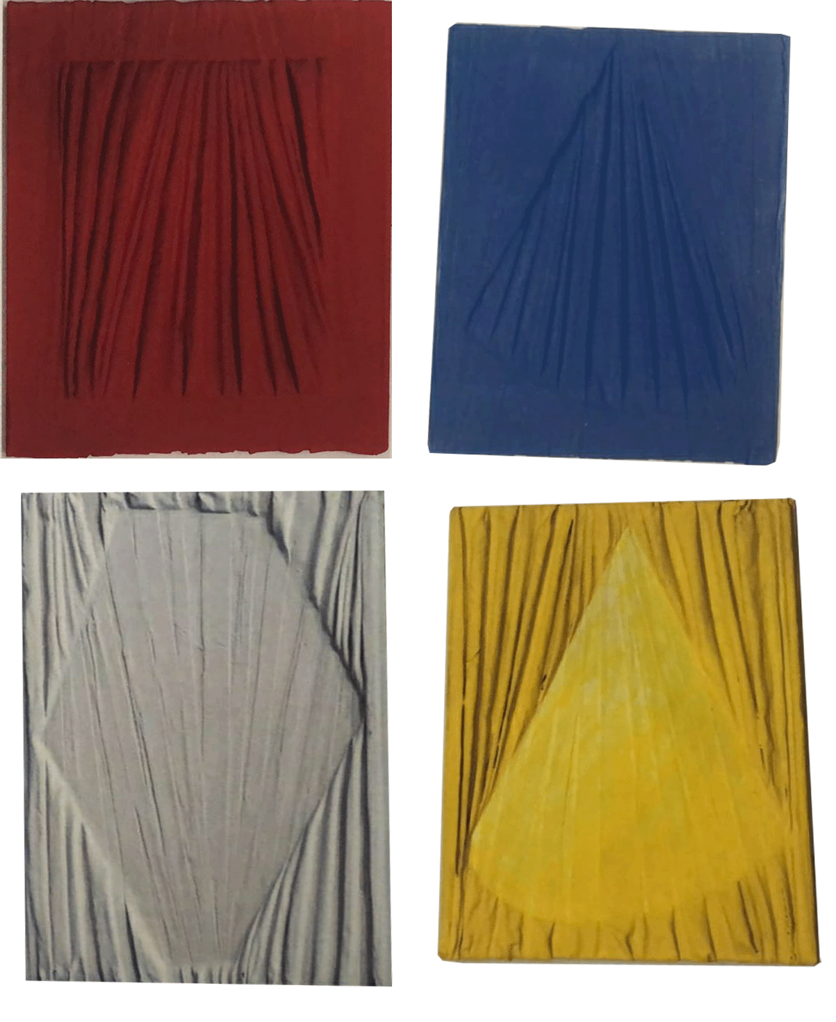 Queste quattro opere costituiscono un bellissimo esempio della ricerca dell'artista Umberto Mariani in merito al famoso ciclo dei suoi “Piombi”. In questi lavori Mariani crea dei panneggi che assumono una veste decisamente iperrealista e volutamente illusoria nella loro consistenza cristallizzata nella materia dura. Il panneggio, dunque, è protagonista dell'opera e ciò implica la compresenza di diverse istanze concettuali molto interessanti. Innanzitutto, la stessa idea di elevare l’oggetto ad opera d’arte, è tipica delle correnti neo-dadaiste e della nostrana Arte Povera, e conseguentemente implica il concetto di ricontestualizzare artisticamente l’oggetto tramite il gesto dell’artista, che nel caso di Mariani si identifica come una piegatura reiterata della materia. Tramite questo procedimento l’opera diventa qualcosa di totalmente nuovo, una sorta di ibrido tra pittura e scultura. Infatti esso è una tela dipinta a monocromo, ma, allo stesso tempo, anche una forma plasmata dall’artista con una compiuta presenza tridimensionale nello spazio. Anzi la tela sembra quasi contenere e nascondere qualcosa al suo interno, assumendo l'aspetto di un sipario calato su una presenza enigmatica e misteriosa. Cosicché la produzione artistica di Umberto Mariani possiede anche quel fascino ermetico e misterioso che possiamo trovare, per esempio, negli oggetti impacchettati di Christo.