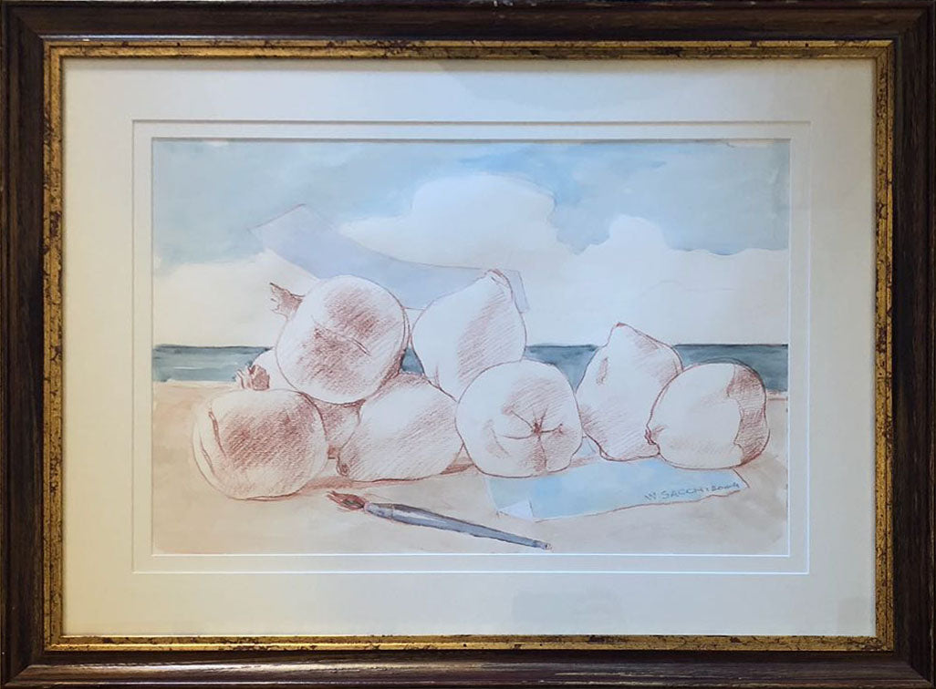 Anche in questa opera con tecnica mista a matita ed acquerello possiamo apprezzare la grande qualità tecnica del pittore Wlady Sacchi. Il suo linguaggio pittorico si basa su un realismo pienamente oggettivo, in cui la precisione della rappresentazione si unisce alla purezza dei volumi. Così anche in questa natura morta gli oggetti appaiono come forme nitide nell'esaltazione dei loro valori plastici. A questo scopo il pittore utilizza l'elegante linea grafica della matita. A livello cromatico poi interviene l'acquerello per dare vita a composizioni armoniose ed equilibrate con delicate velature di colore.